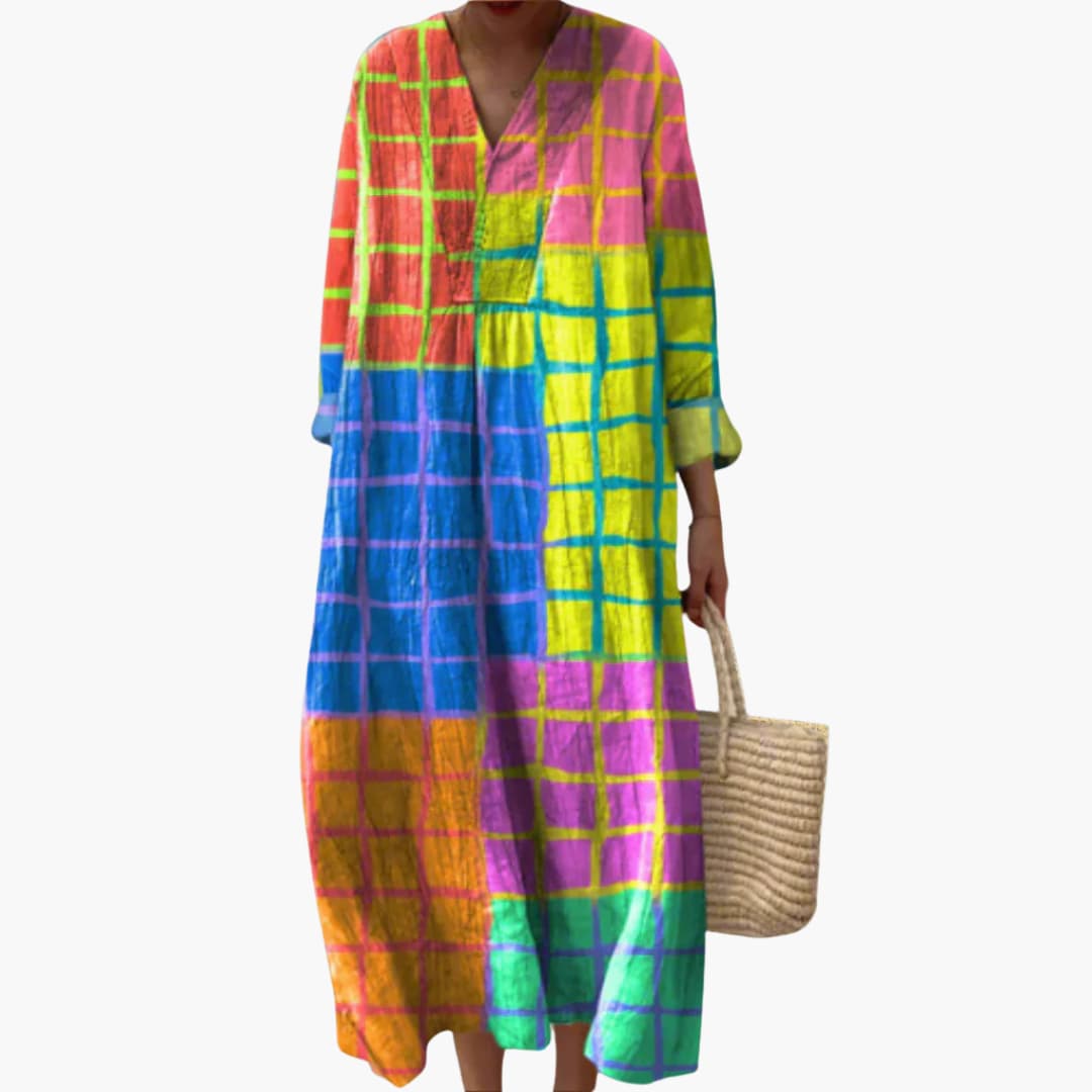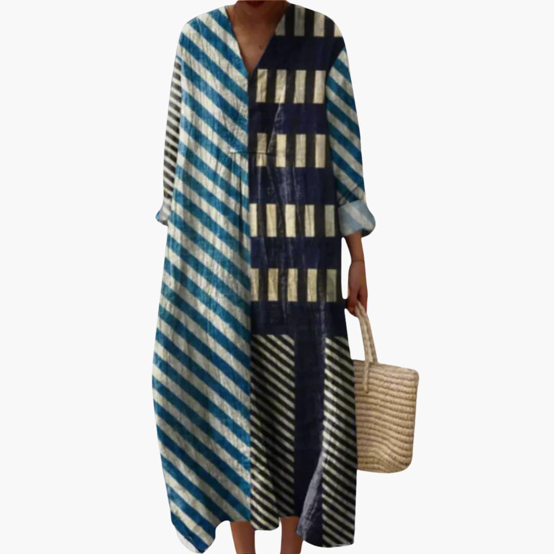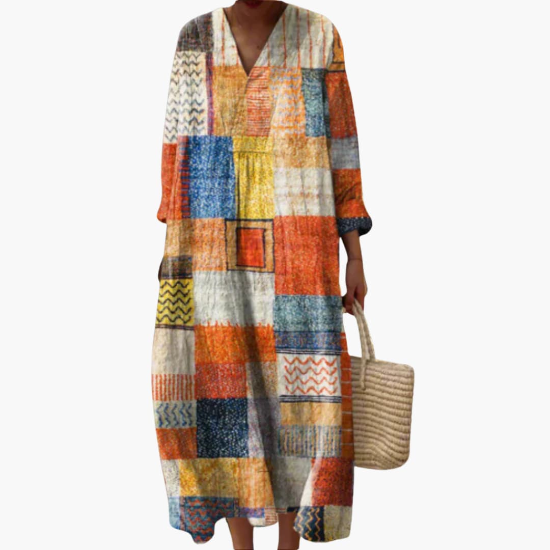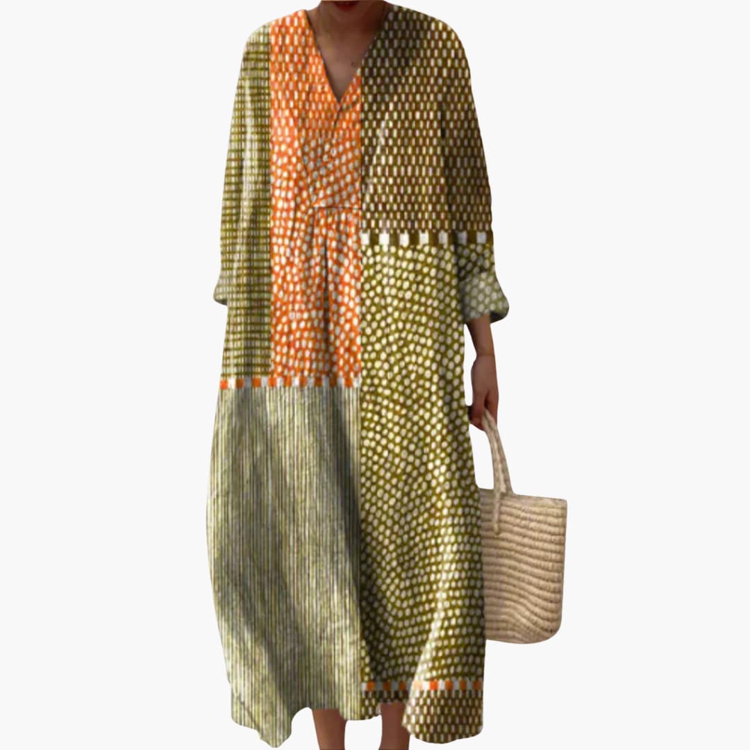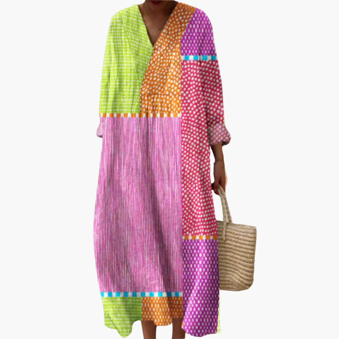 Women’s V-Neck Long Sleeve Ankle-Length Dress – Geometric Patchwork
