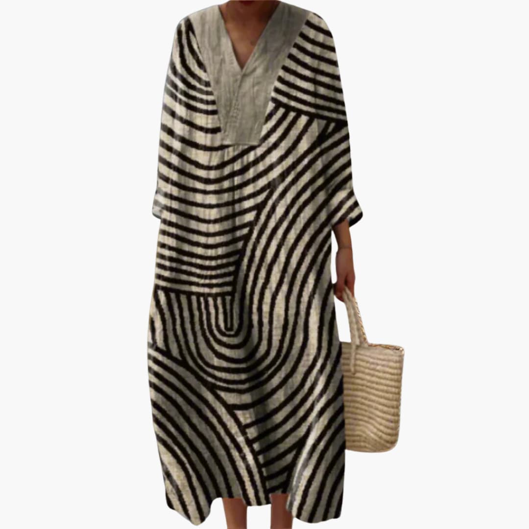 Women’s V-Neck Long Sleeve Ankle-Length Dress – Monochrome Stripe