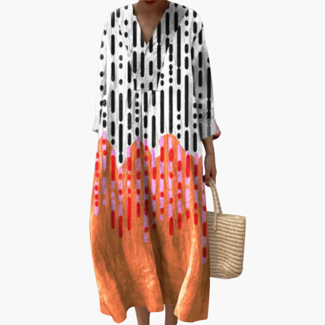 Women’s V-Neck Long Sleeve Ankle-Length Dress – Geometric Dot Print