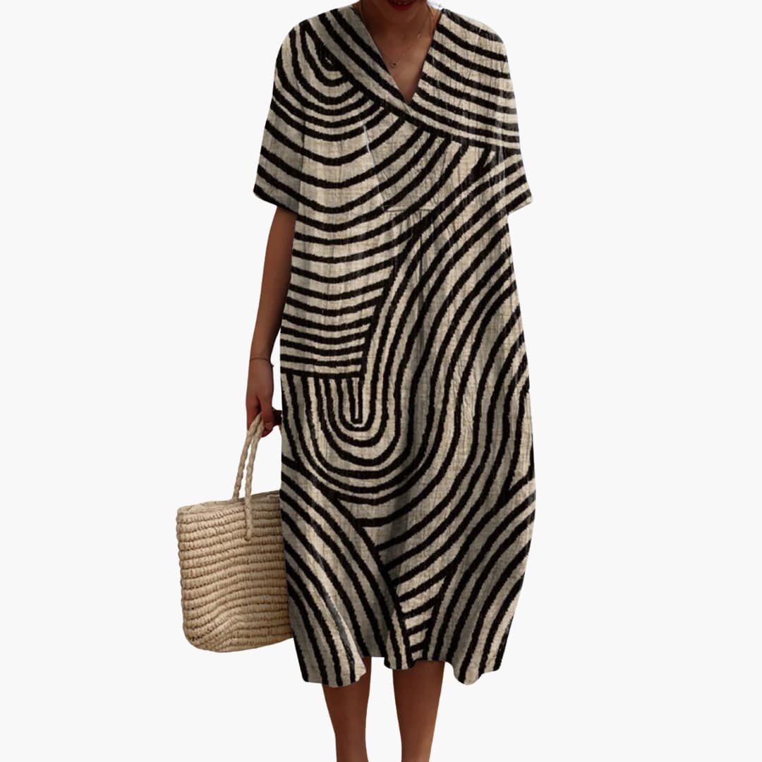 Women’s V-Neck Midi Dress with Short Sleeves and Graphic Line Pattern