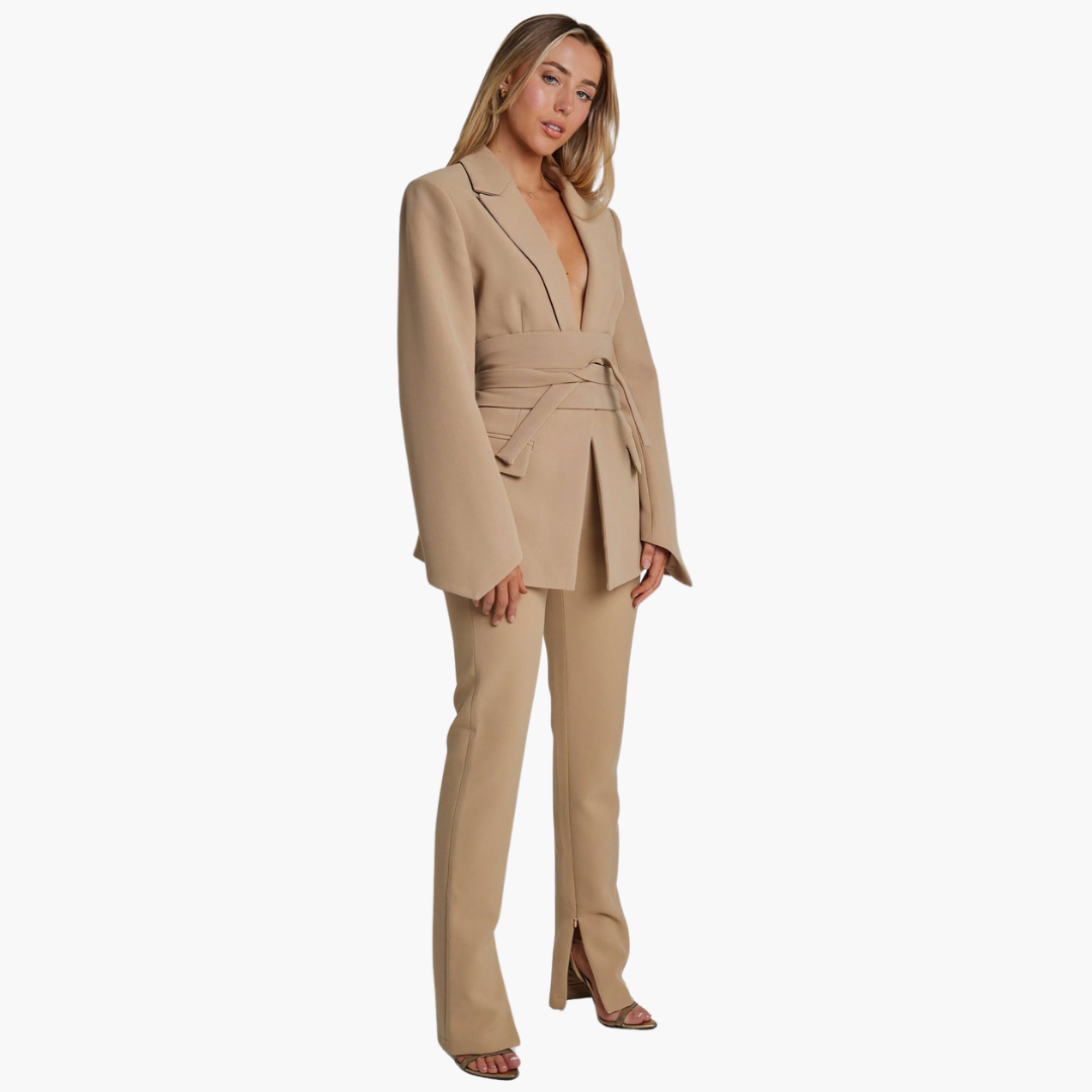 This blazer is designed with a structured neckline and long sleeves with defined shoulders. The fitted shape follows the natural waist and includes an adjustable belt for a more defined outline. Cut to hip length, it creates a structured silhouette and is finished with a plain woven surface suitable for layering.