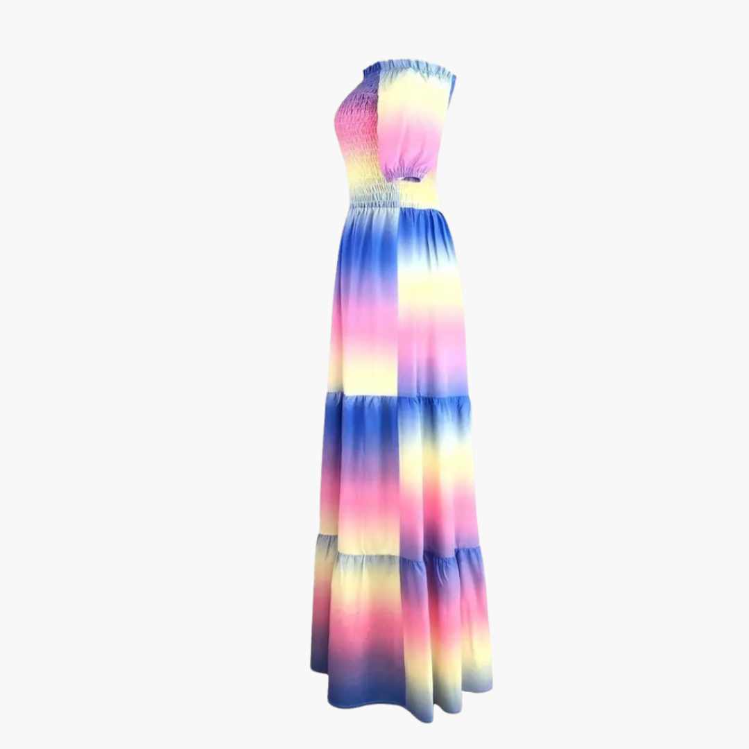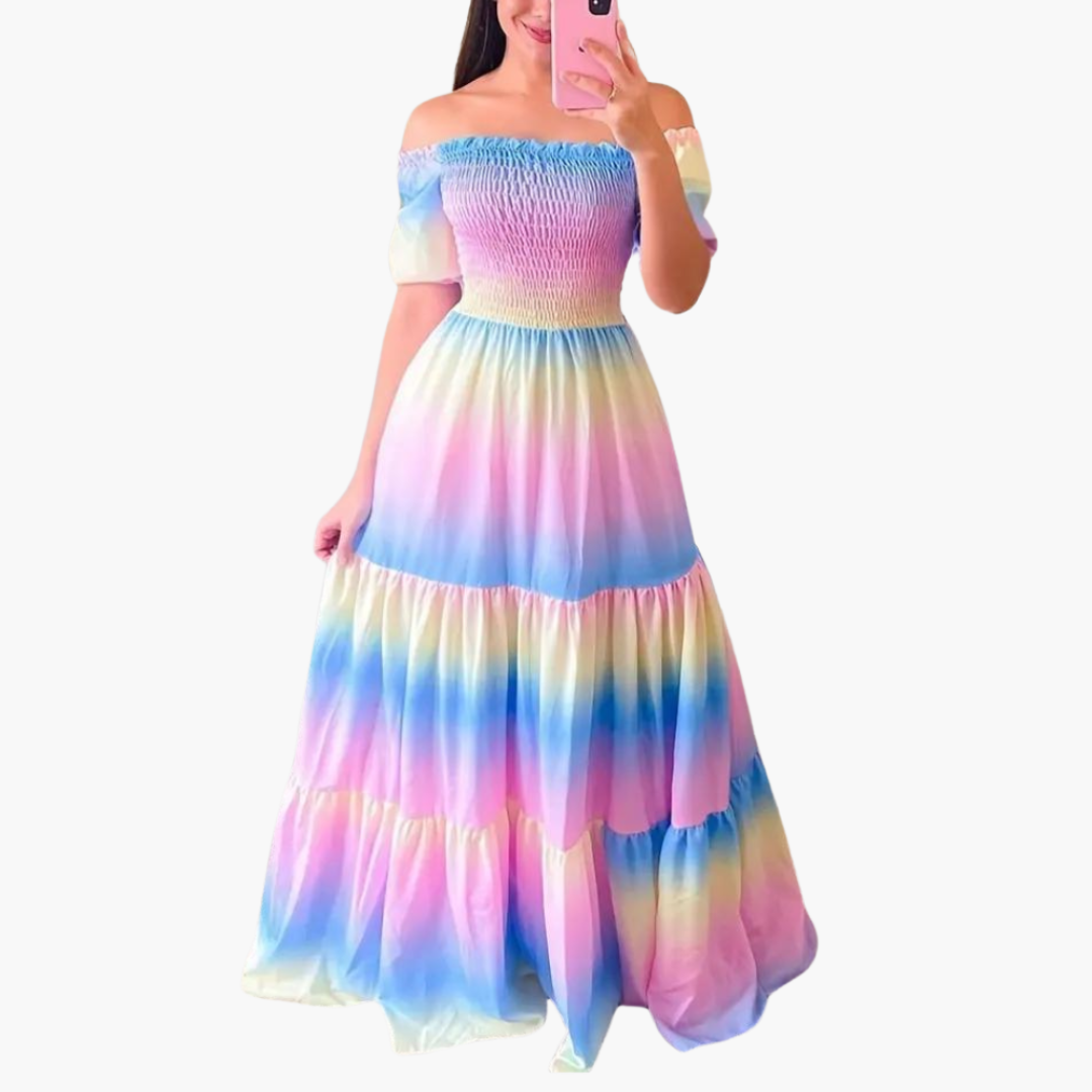 This off-shoulder layered summer dress features a soft pastel hue and a lightweight fabric suitable for warmer weather. It includes an elasticated top and a long length, offering a secure fit. Ideal for casual wear or beach outings. Machine washable for convenience.