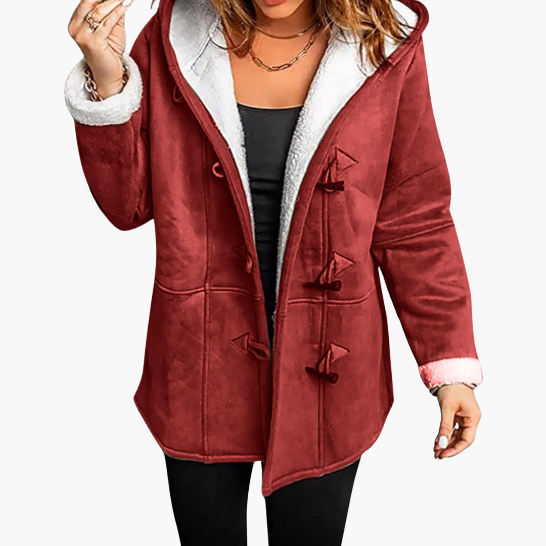 Women’s hooded winter coat featuring toggle closure and fleece-lined interior