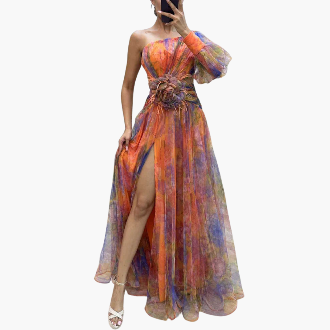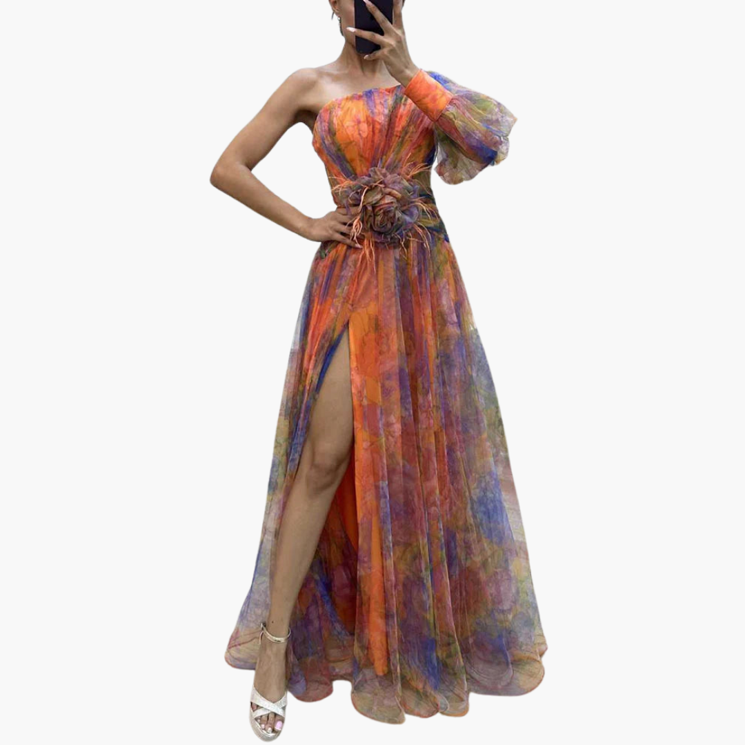 Elegant women’s one-shoulder dress featuring a tailored fit, floral print, and side slit