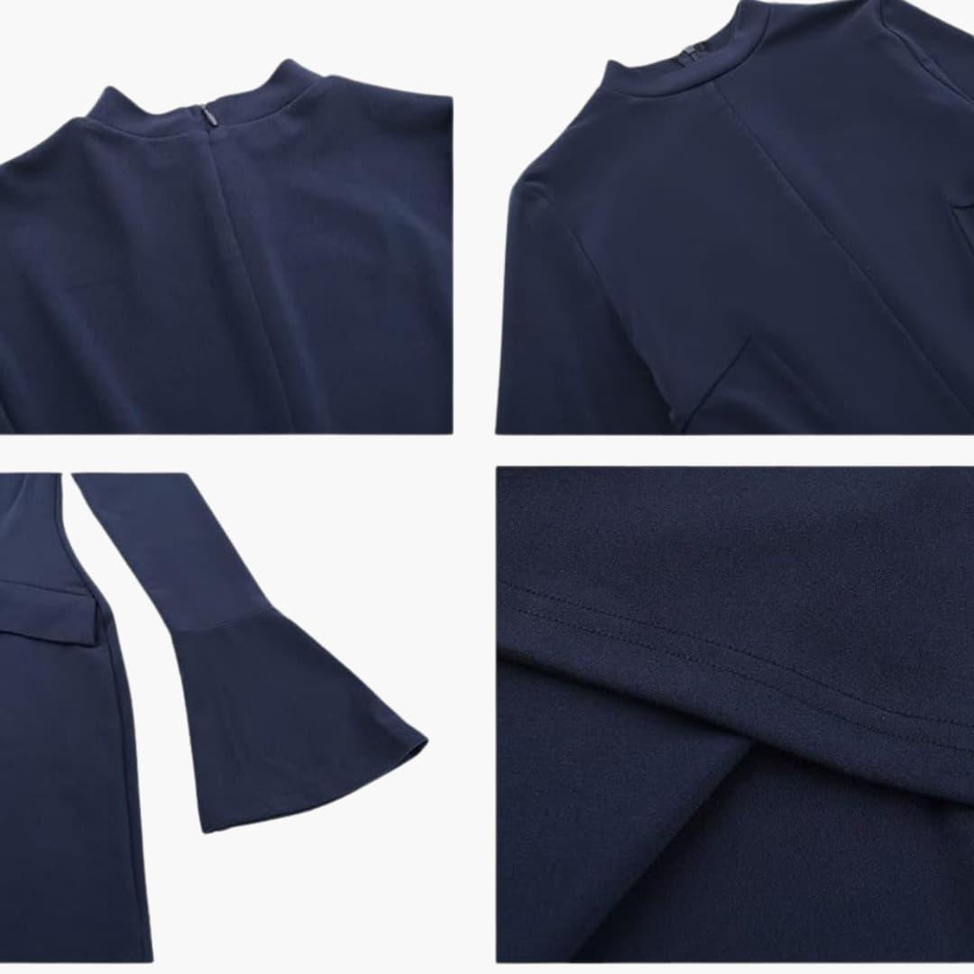 This women's bodycon mini dress features long sleeves, a high neckline, and bell cuffs. The design provides a flattering fit, while the stretchy fabric offers flexibility. This versatile dress is suitable for both day and evening wear, making it a timeless addition to any wardrobe.