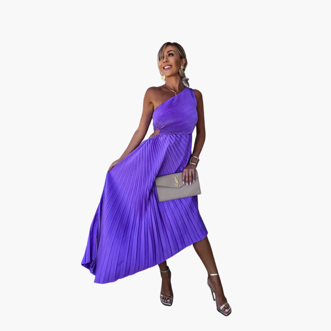 Chic one-shoulder midi dress with pleated design and fitted waist