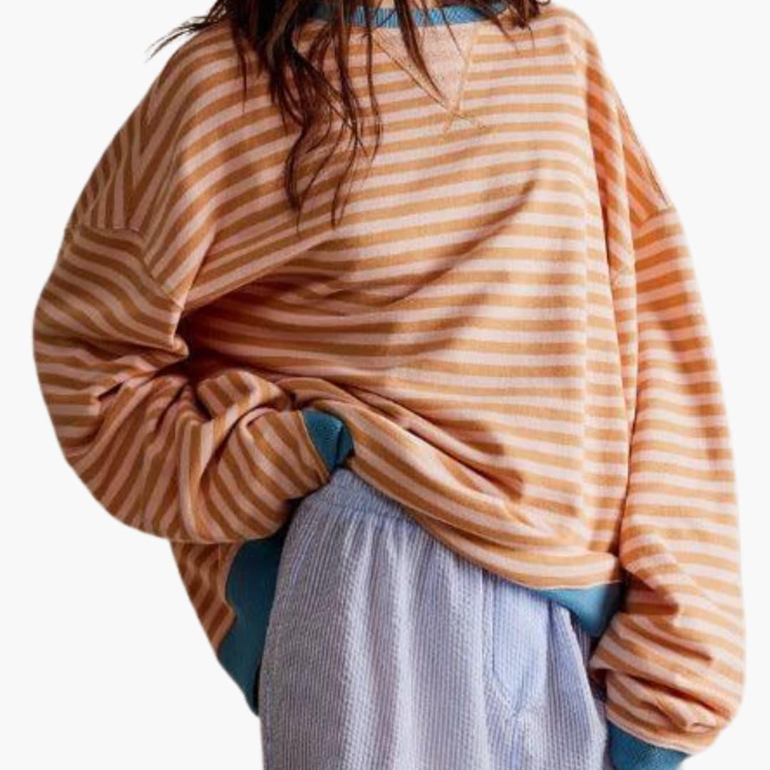 This women’s knit jumper features a striped pattern with long sleeves and a crew neckline. The relaxed fit makes it suitable for both spring and autumn weather. The fabric is light enough for warmer days and can be worn throughout different seasons.