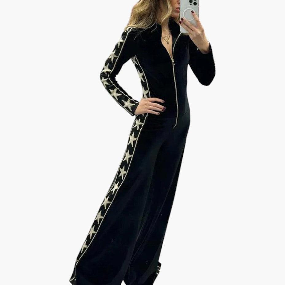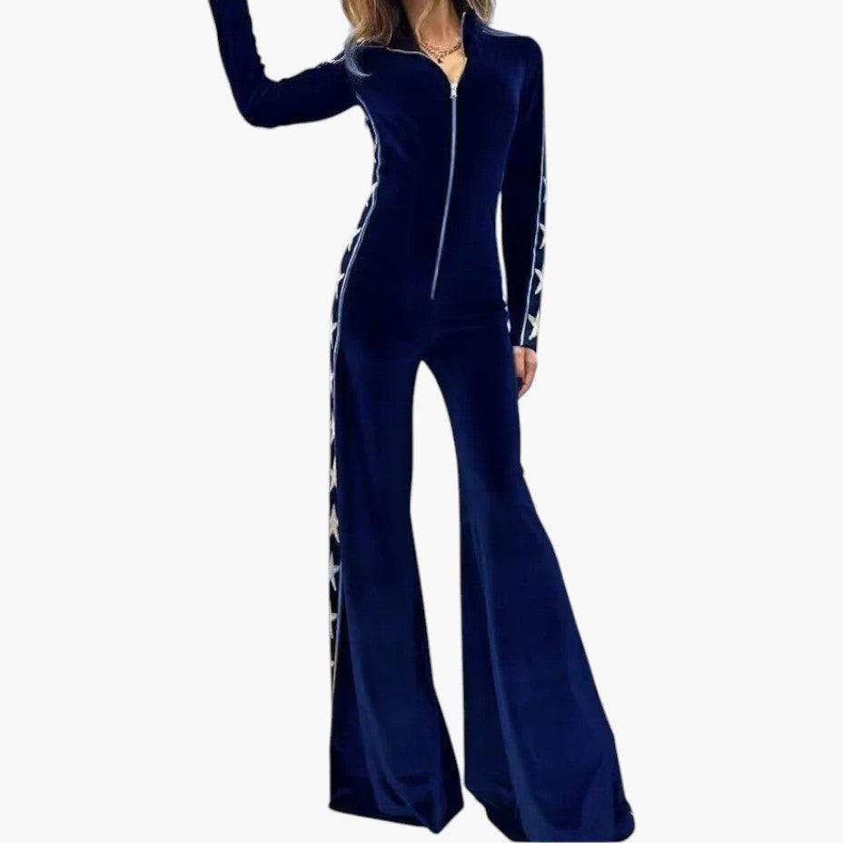 Women's Velvet Jumpsuit with Star-Print Design and Zip Front Closure