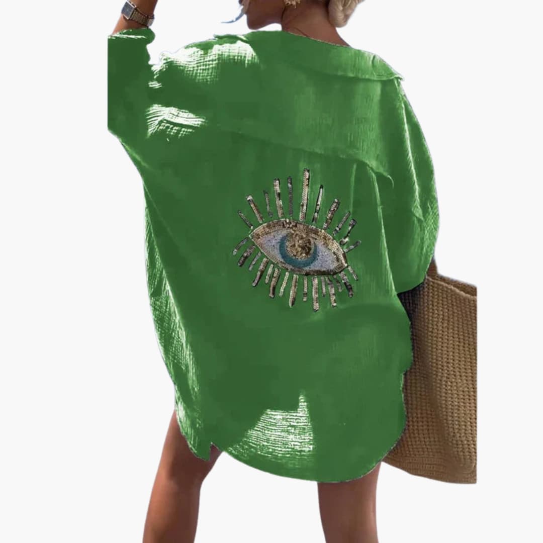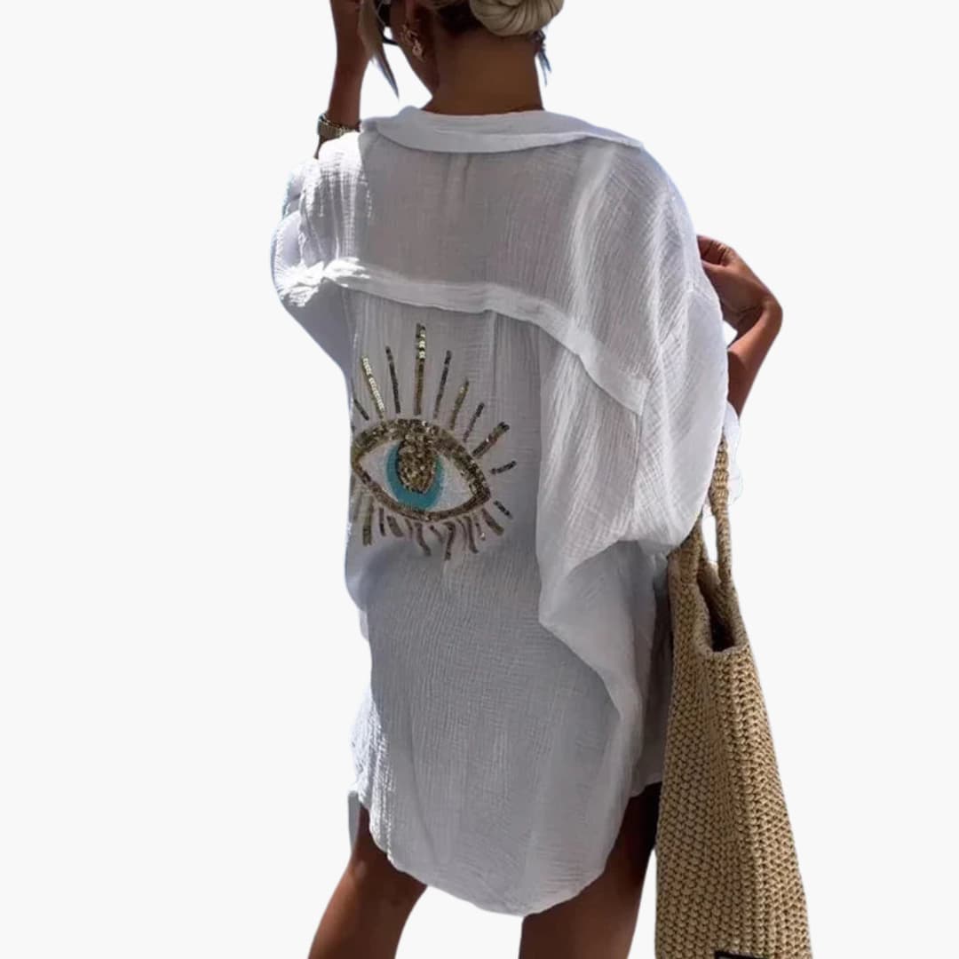Women’s oversized beach shirt with long sleeves and embroidered back motif