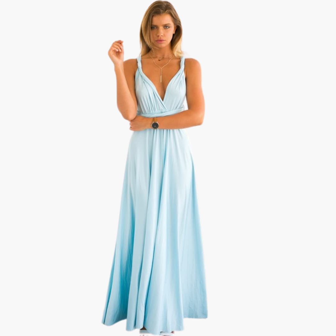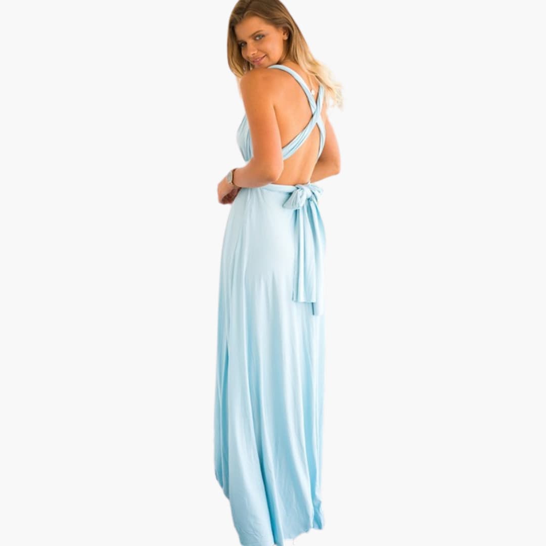 This women’s convertible maxi dress features a backless design, adjustable waist tie, and multiway straps for a customisable fit. Designed for year-round wear, this dress offers a maxi length suitable for various occasions, including bridesmaid or casual events.