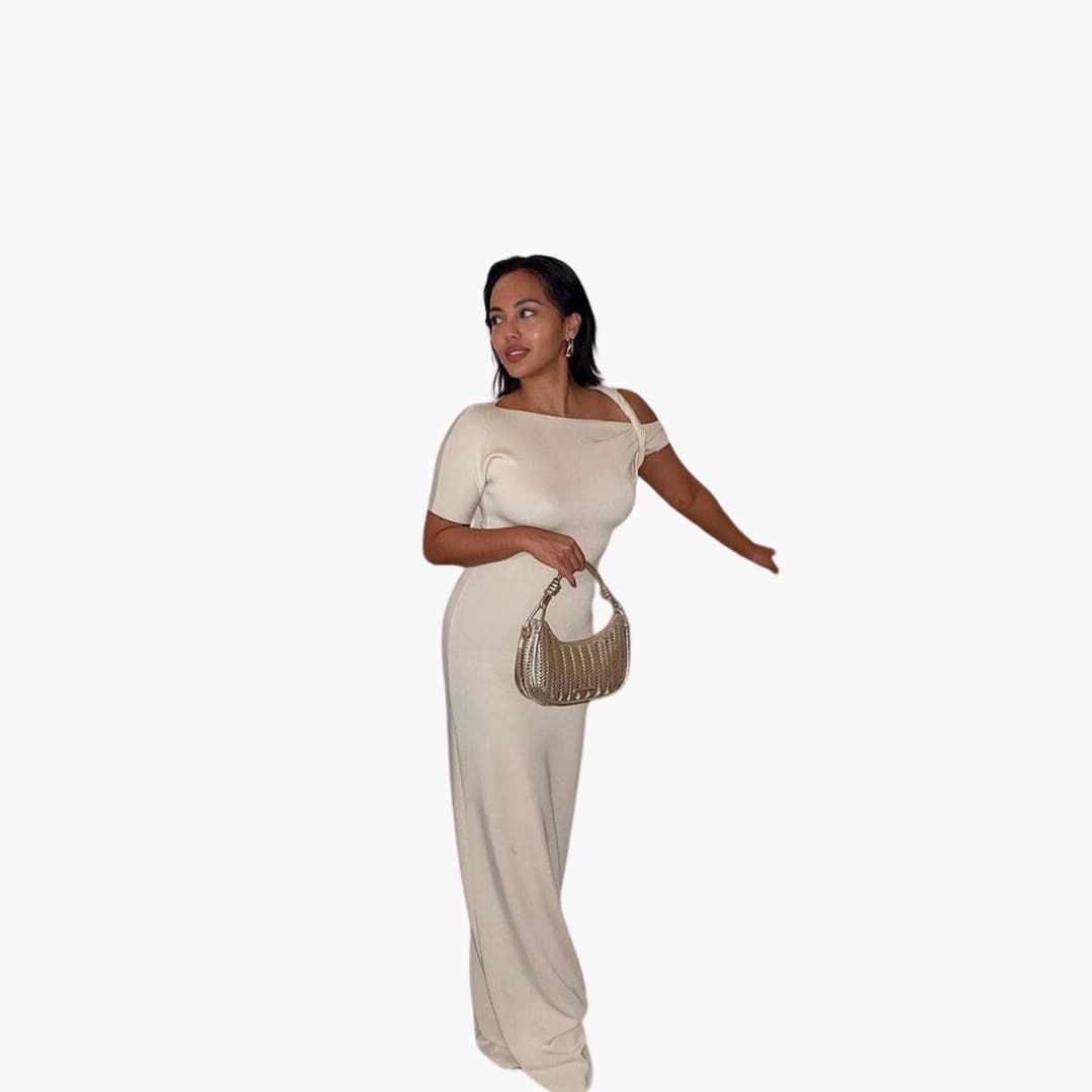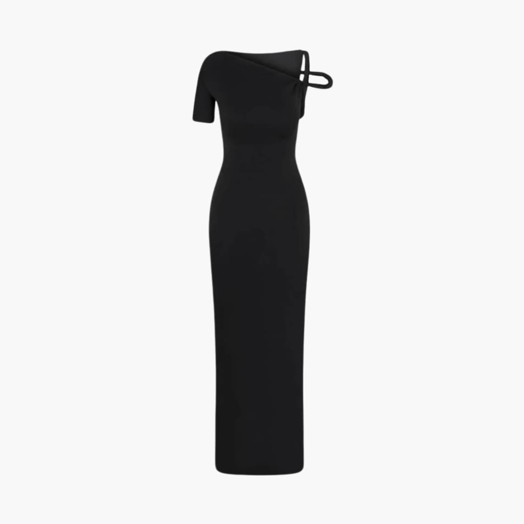 Women’s one-shoulder maxi dress with twisted sleeve loop and long skirt