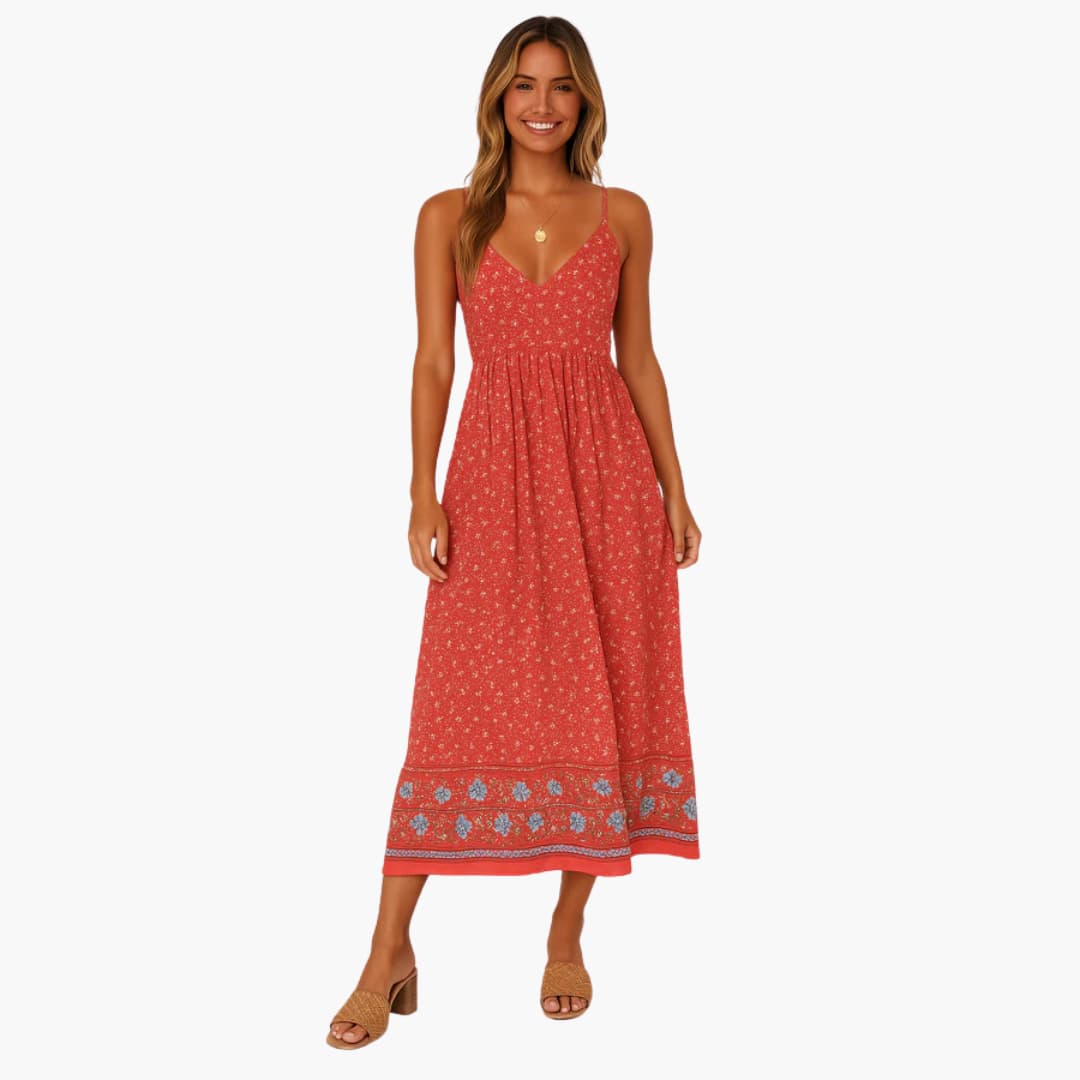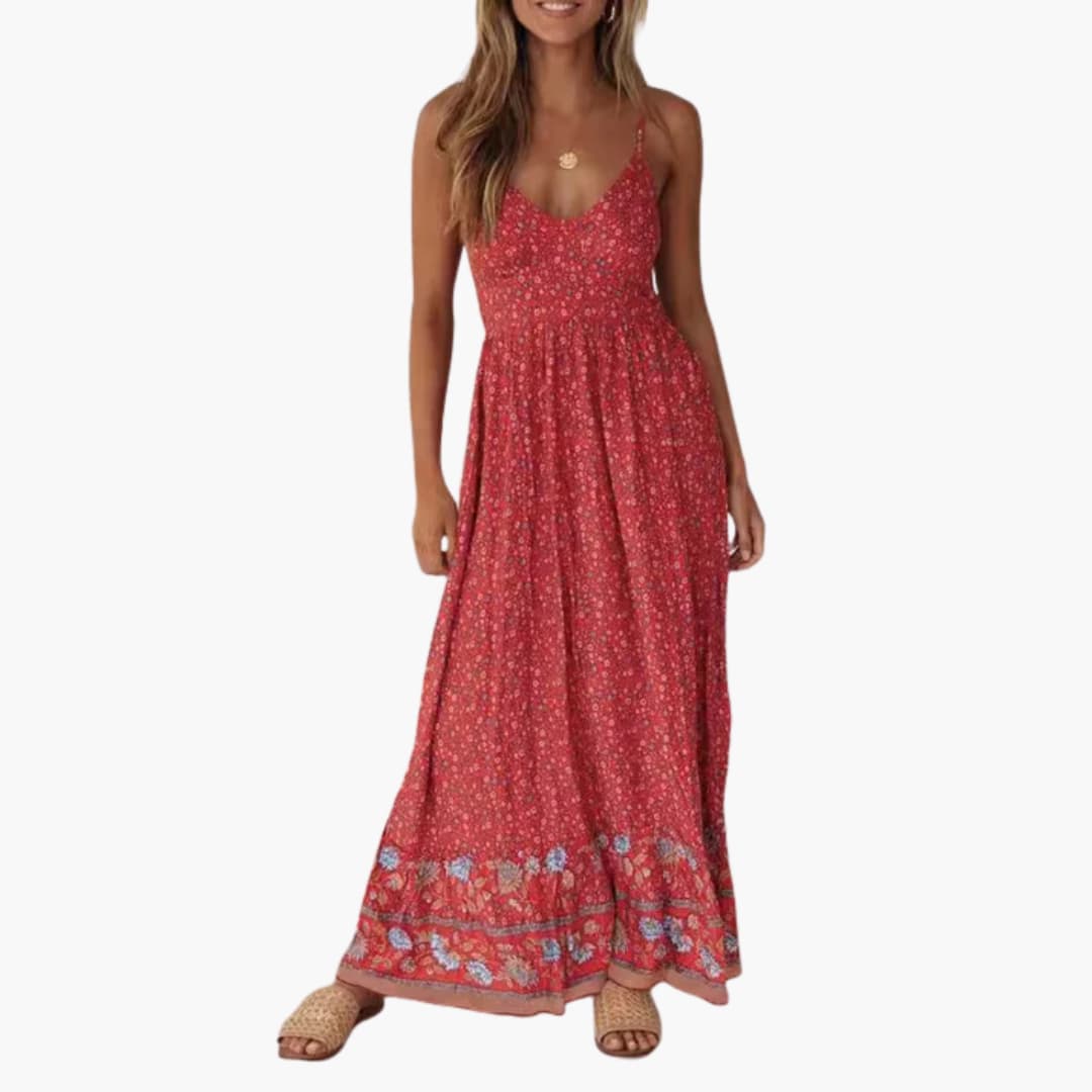 Boho-style maxi dress with floral print, thin straps, and ankle-length design
