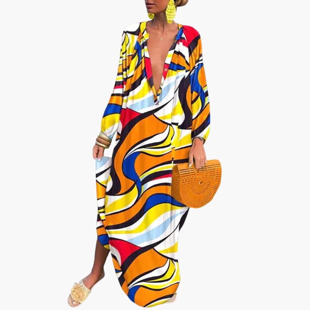 This maxi dress features a flattering deep V-neckline with a button-through placket detail at the front. The long sleeves are finished with softly gathered cuffs for a gentle shape at the wrist. The bodice falls into a relaxed, oversized silhouette without a defined waist, offering effortless. The hemline falls to ankle length and is finished with an all-over abstract print for a bold yet elegant look.