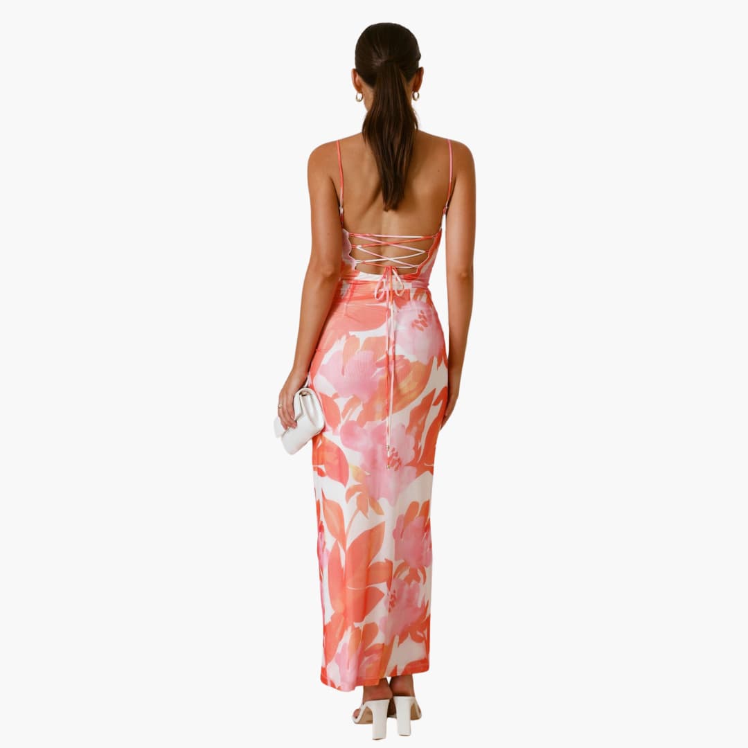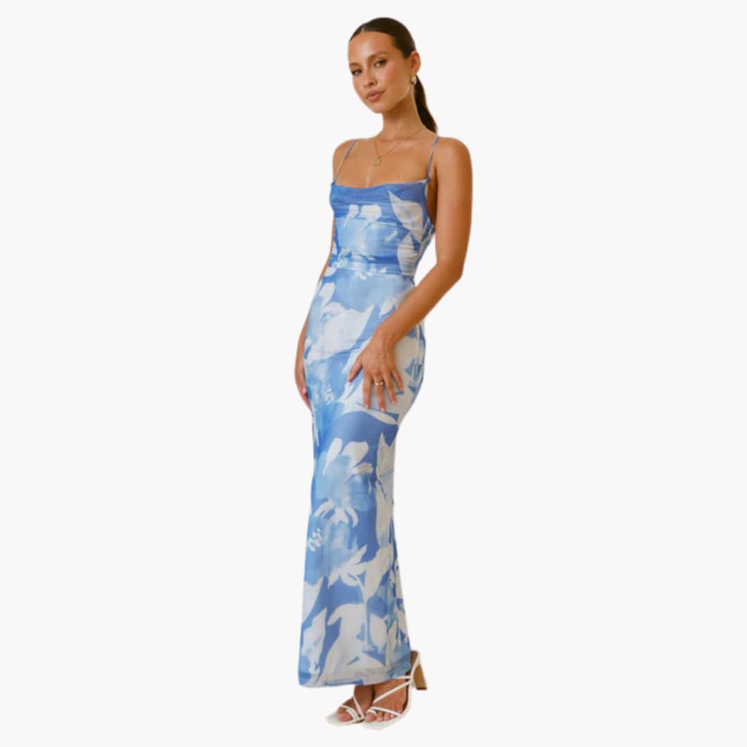 This maxi dress features a softly draped cowl neckline and slim adjustable straps. The bodycon fit contours the figure to a full-length hem. It includes a lace-up back detail and a concealed back zip fastening. A sheer mesh overlay with an inner lining showcases an all-over floral print.