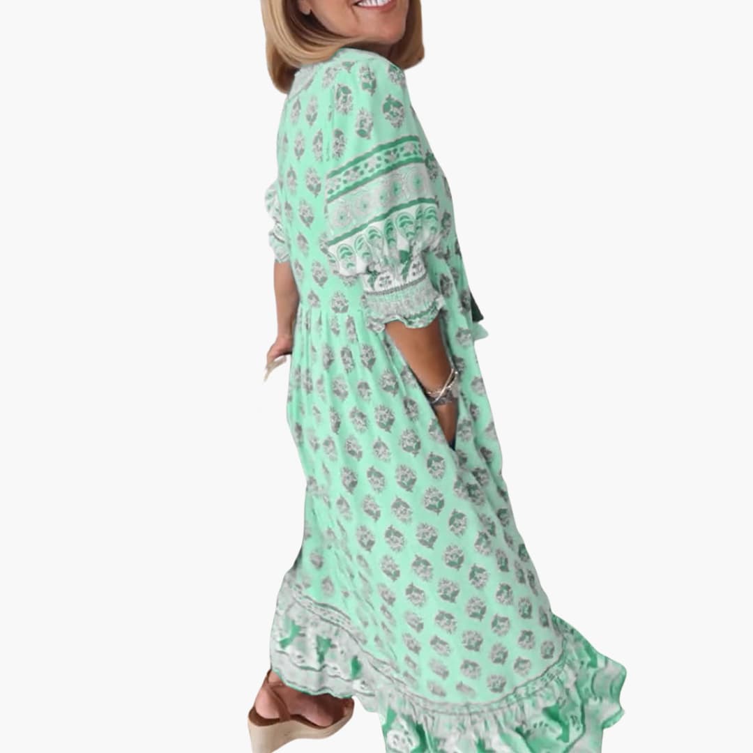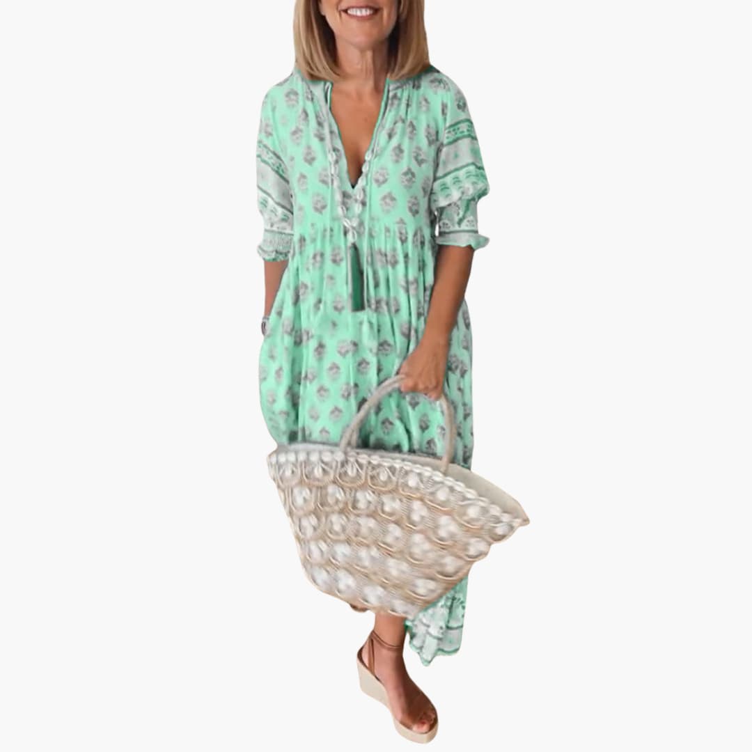 This women’s summer dress features a V-neckline and half sleeves. The relaxed fit and all-over printed design create a stylish look, while the midi to long length provides versatility for various occasions. Ideal for warm climates and year-round wear.
