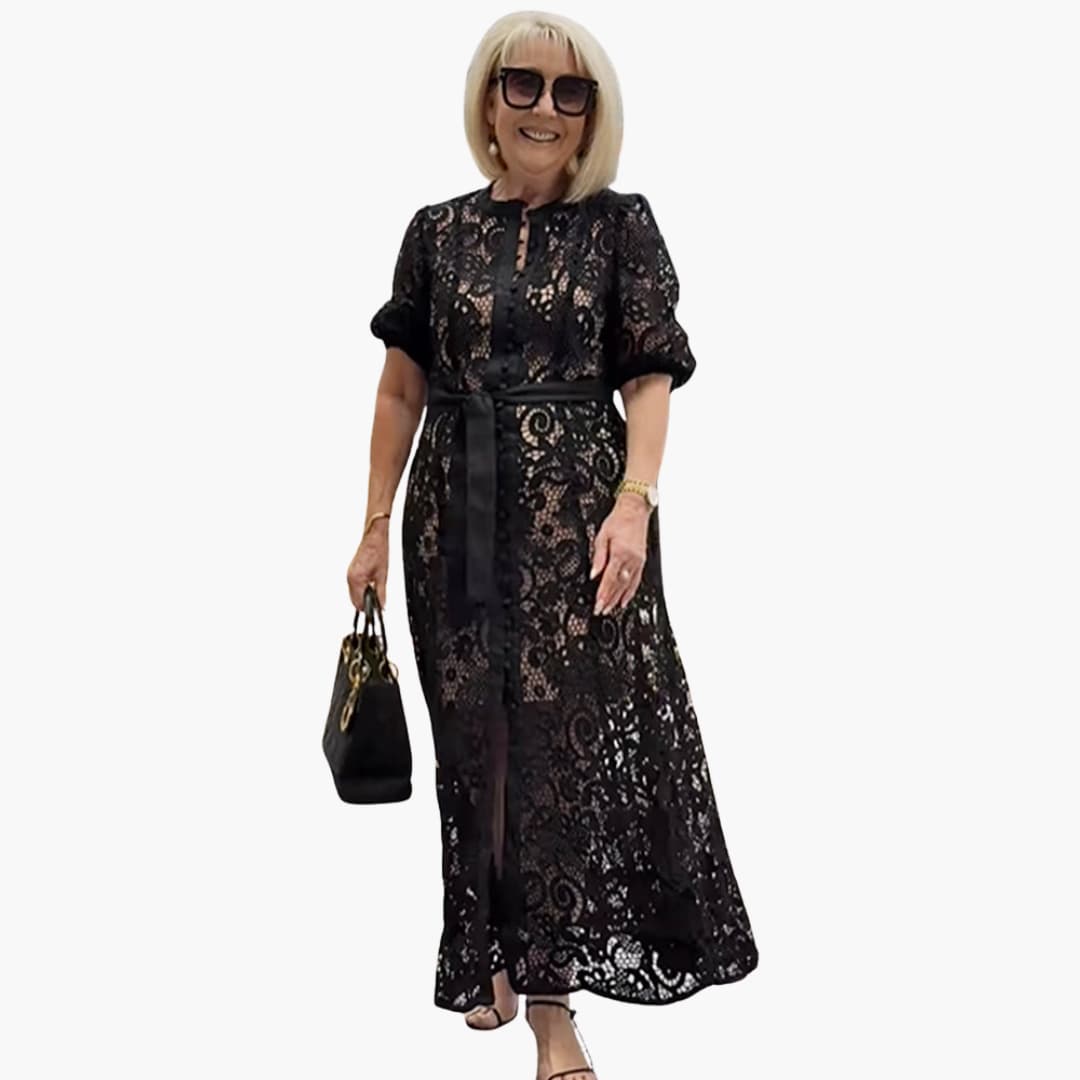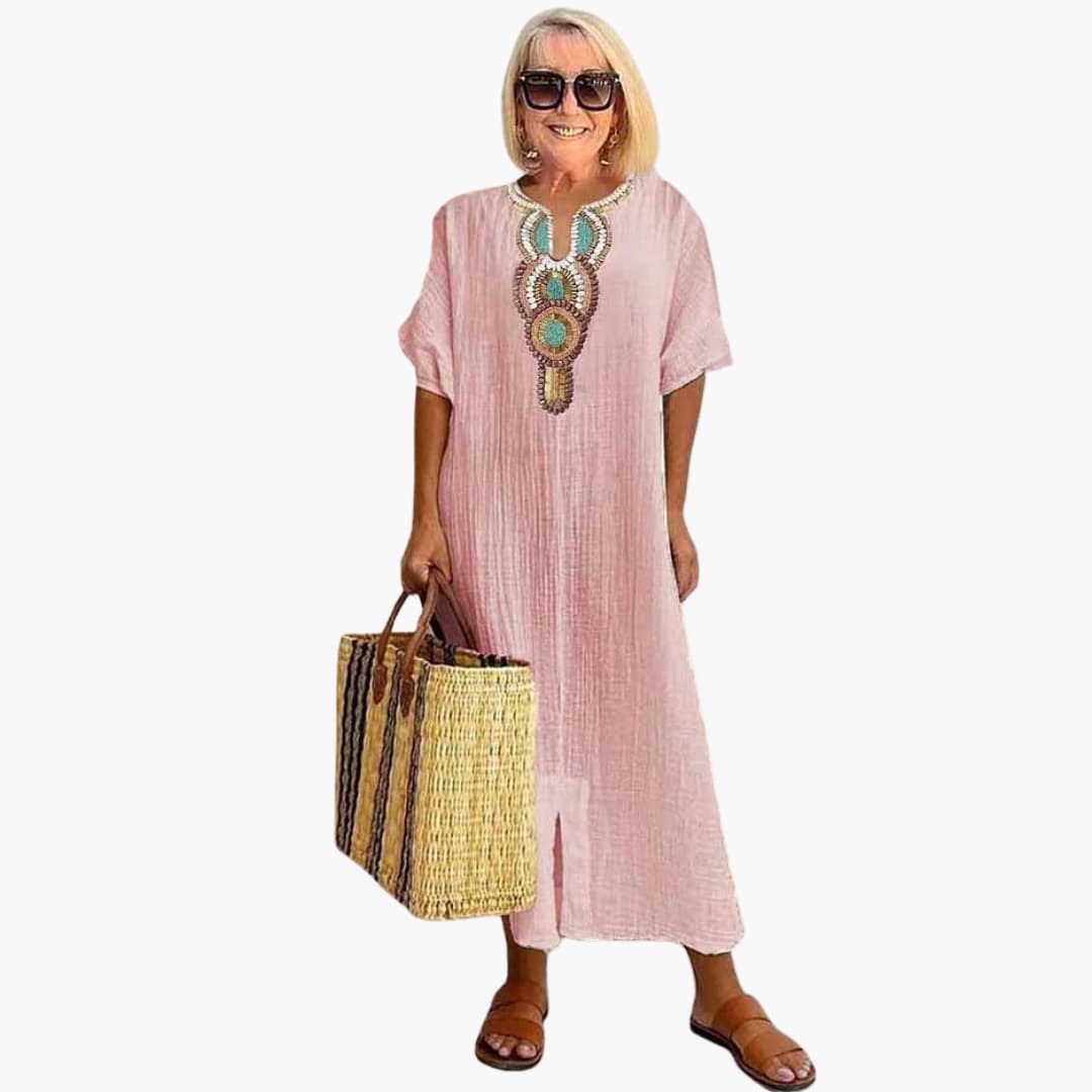 Women's Maxi Dress with Embroidered Neckline and Side Slit