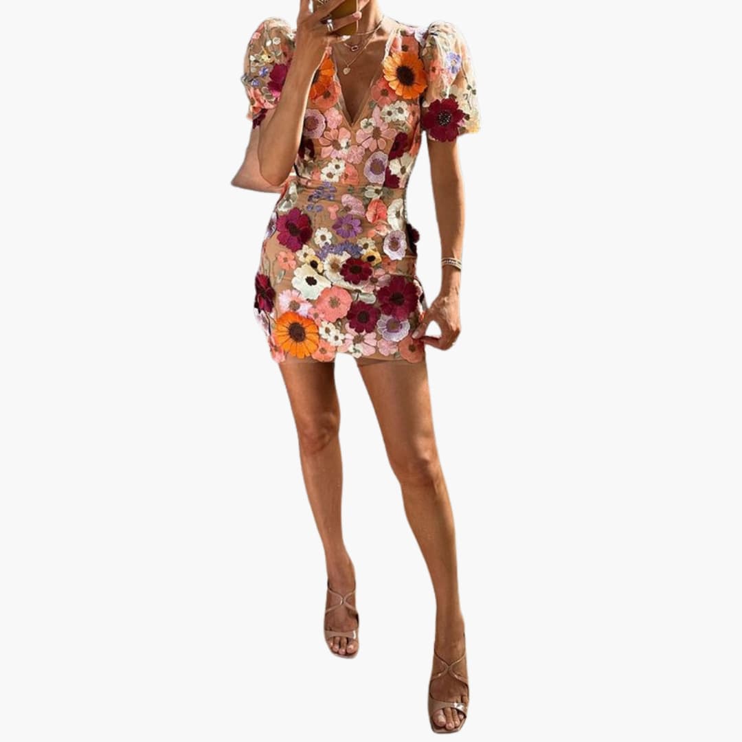This women’s mini dress features a V-neckline and puff short sleeves. The dress is designed with multi-colour floral embroidery and a sheer mesh overlay. The figure-skimming fit complements the mini-length cut, creating a stylish option for spring and summer occasions.