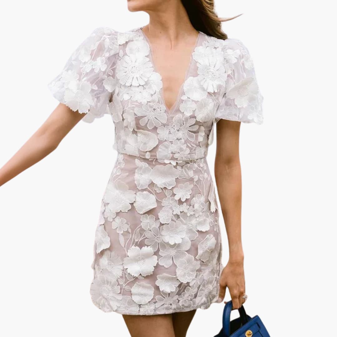 Women’s mini dress with V-neckline and puff sleeves