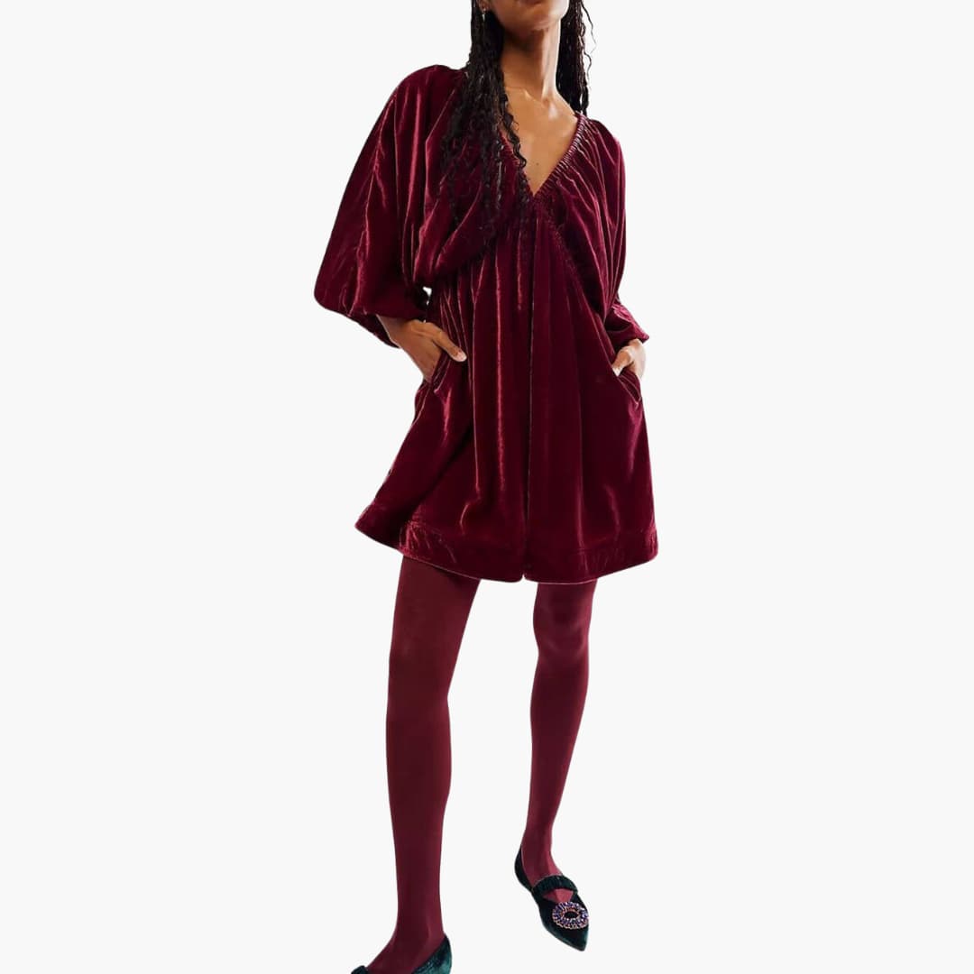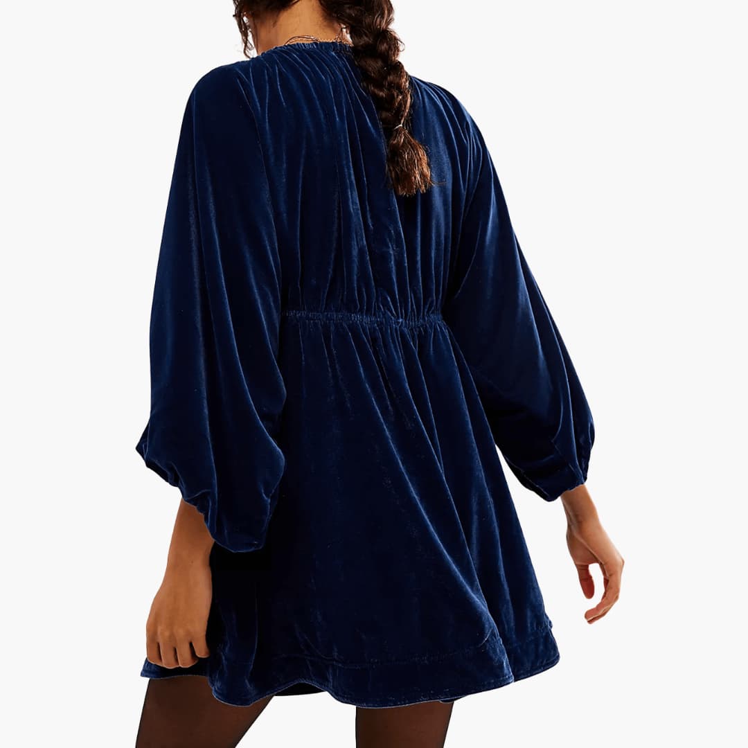 Women’s velvet mini dress with deep V-neck and long sleeves