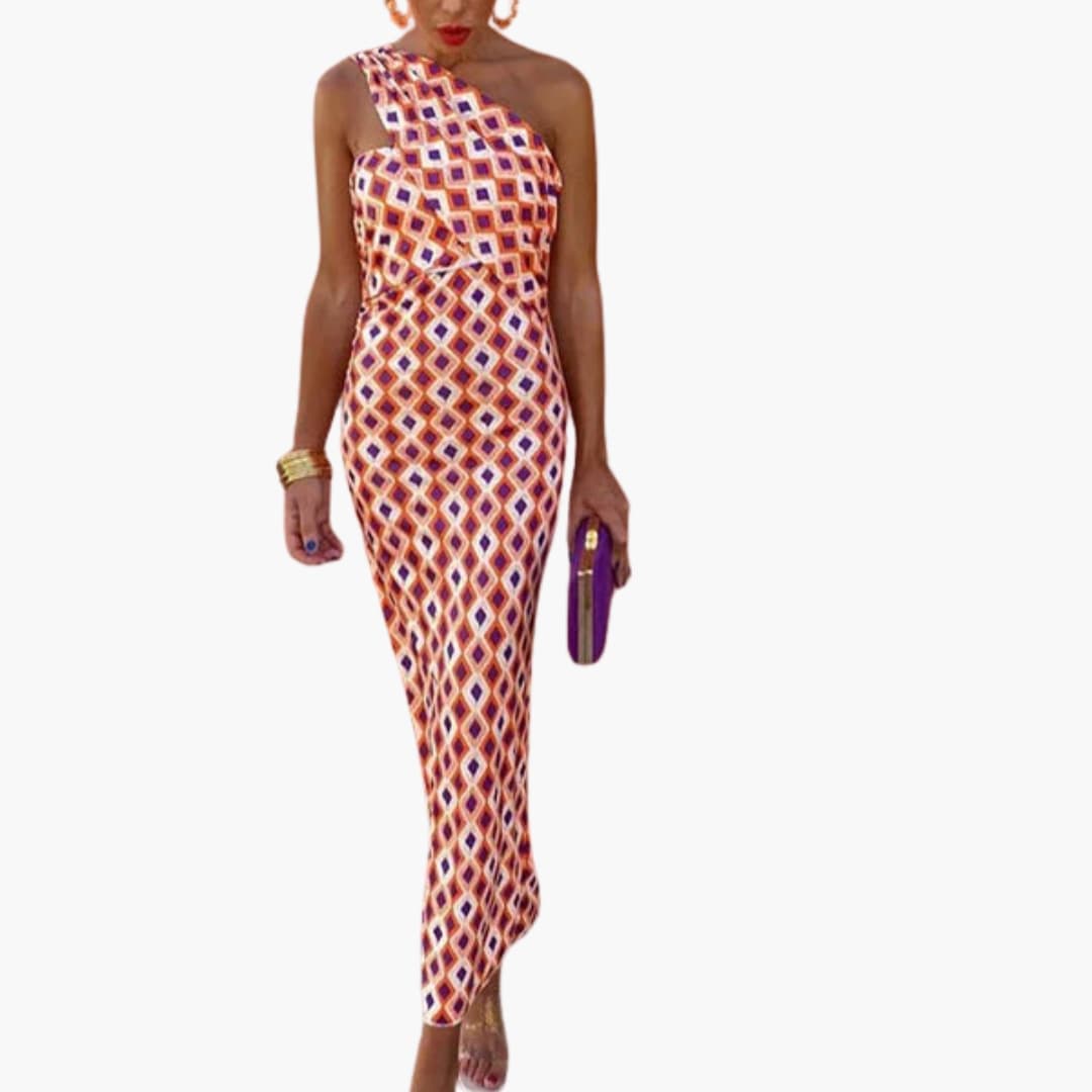 This dress features a unique asymmetric neckline and a fabric designed for comfort. The sloping shoulder adds an eye-catching twist, while the material makes it suitable for warmer climates. Available in a range of colors for a bold look.