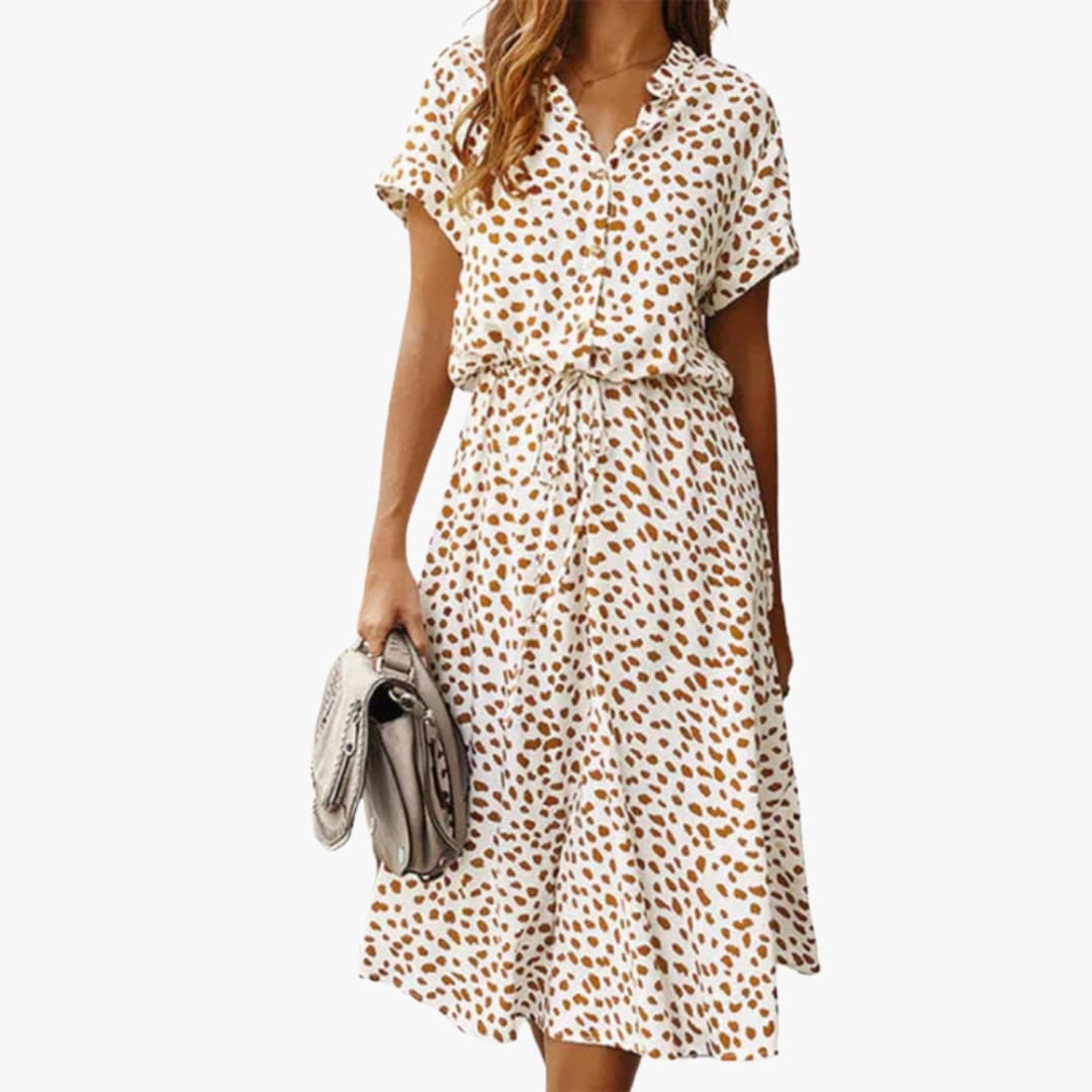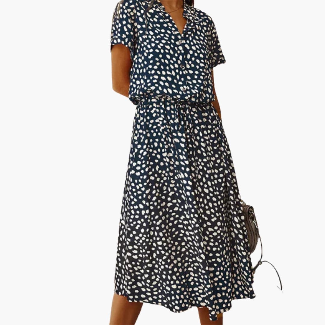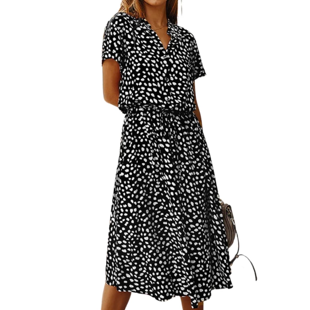 A V-neckline with collar and button-front fastening defines the upper design. Short sleeves frame the bodice above an adjustable drawstring waist. The skirt falls to a mid-length hem with a flared shape. Finished with an all-over printed surface for added visual detail.