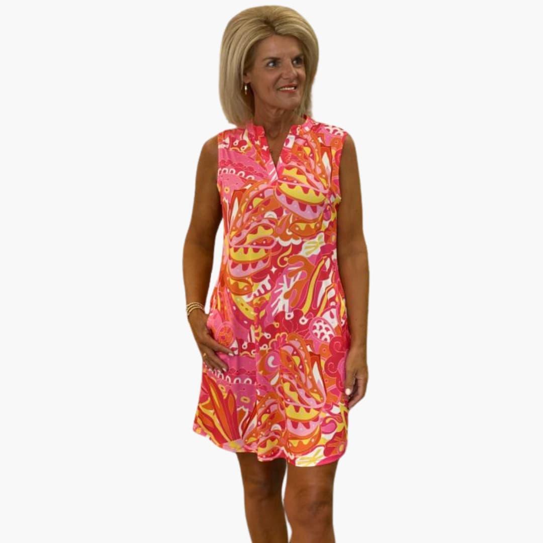 This women's sleeveless midi dress features a V-neck and a flowy fit, designed for a relaxed silhouette. The versatile design makes it suitable for both casual and semi-formal events. Ideal for holidays or beach outings.