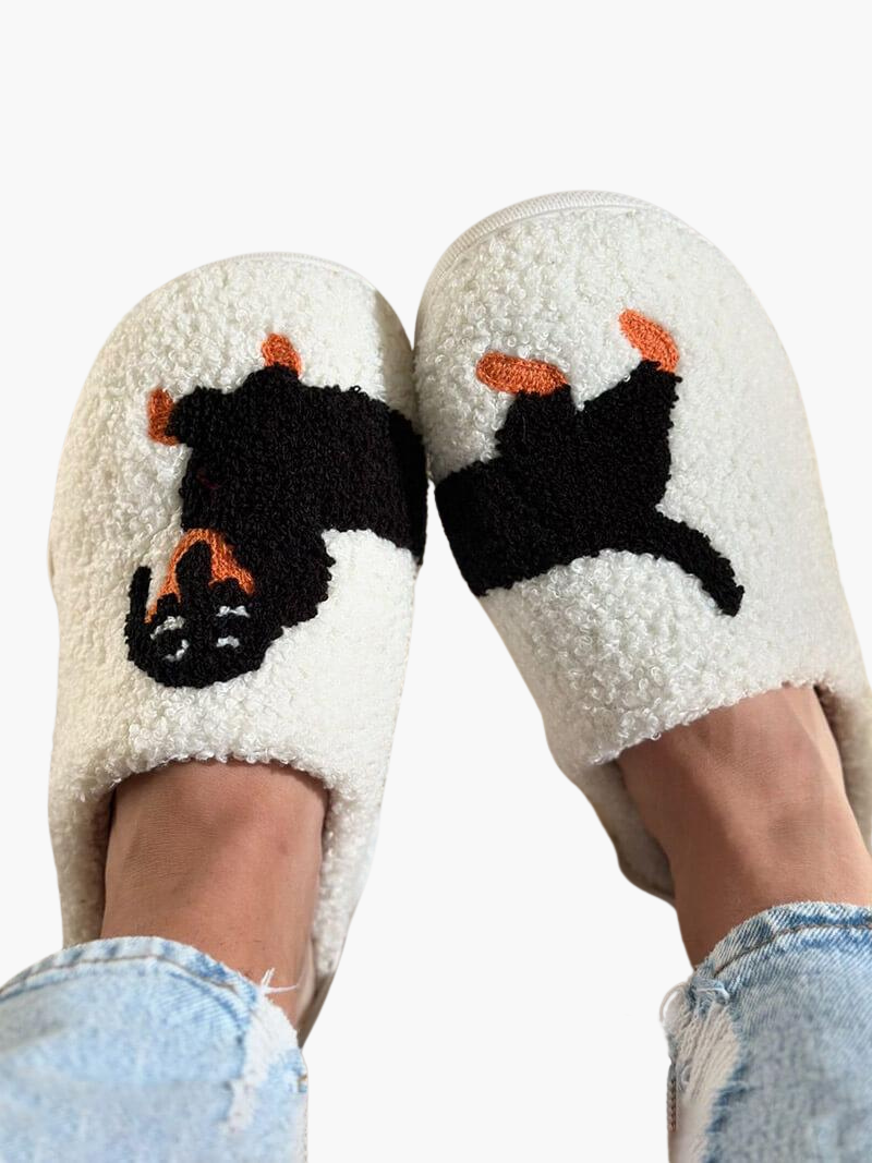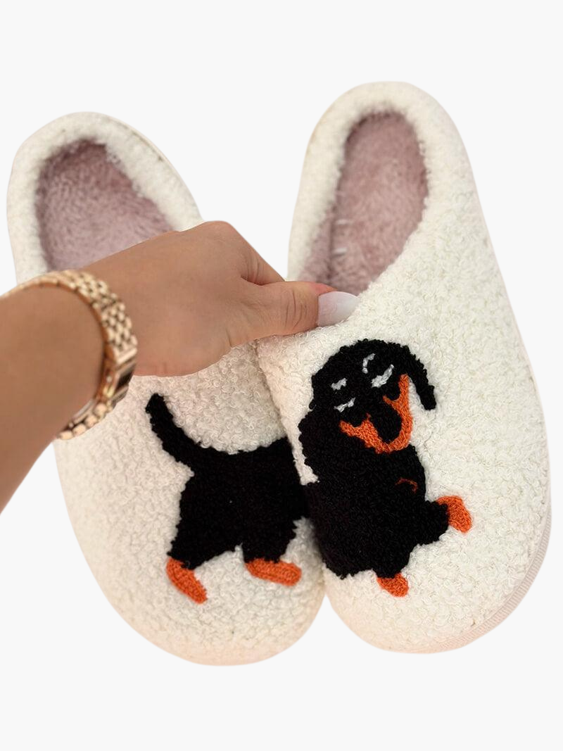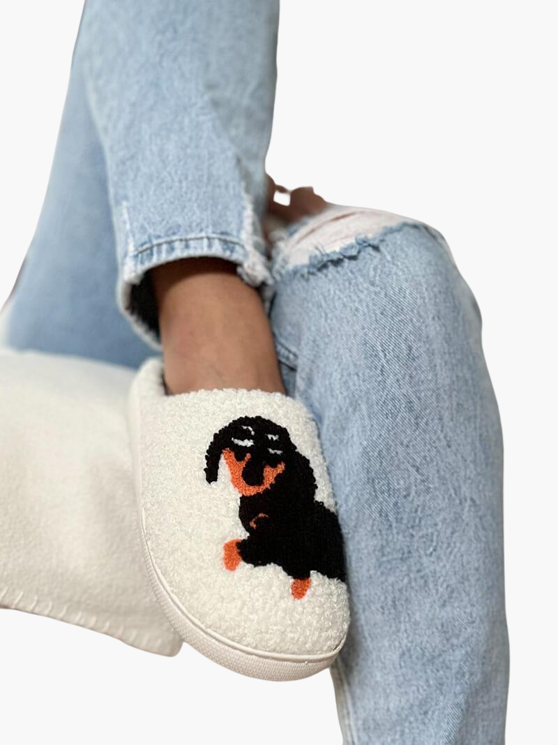 These women’s indoor slippers feature a dog-themed design with a woven interior lining. Designed with a slip-on style, rounded toe, and patterned sole, they provide a defined shape for indoor use. The exterior surface has an even texture suitable for autumn, winter, or year-round wear in the UK.