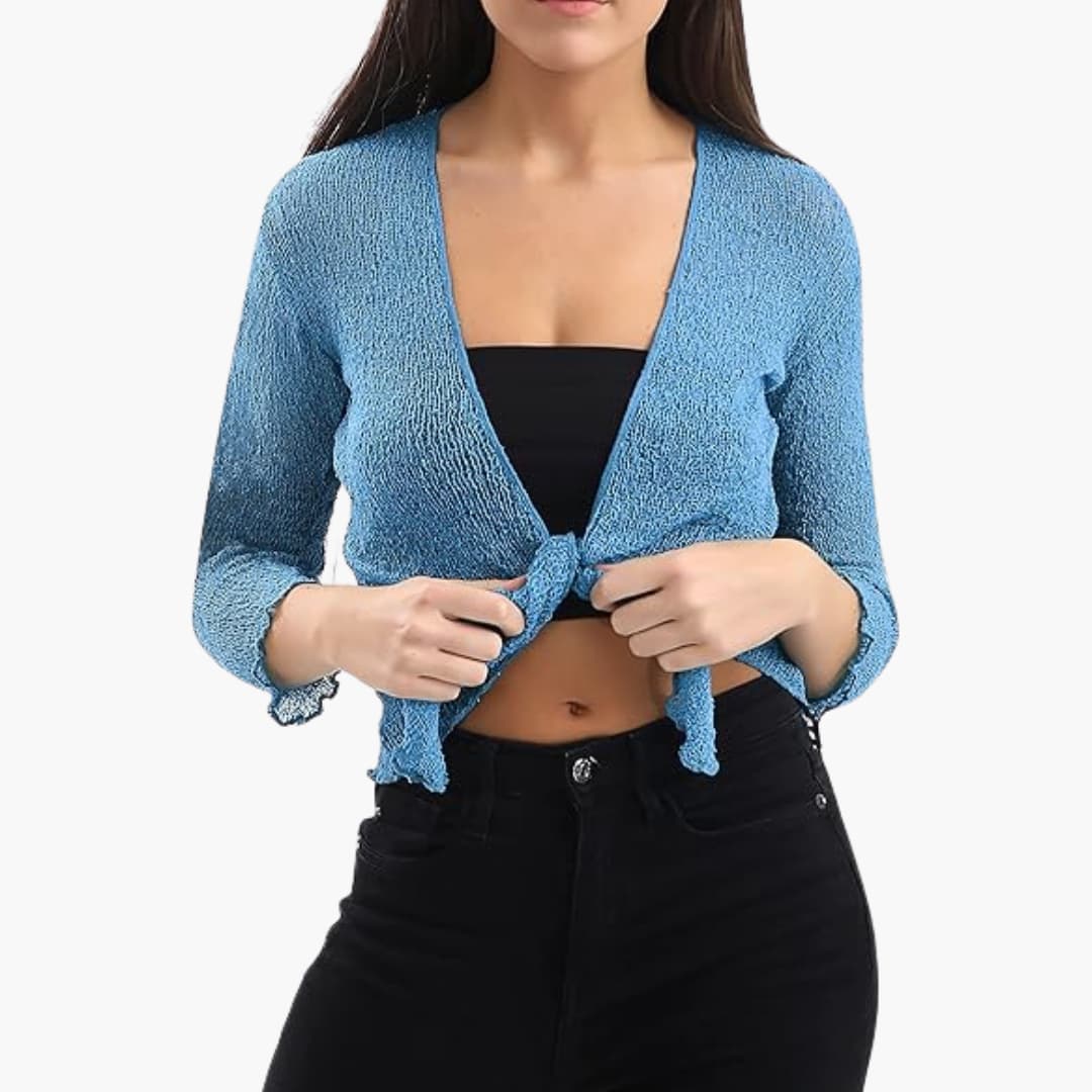 Lightweight cropped tie-up shrug with sheer knit and three-quarter sleeves