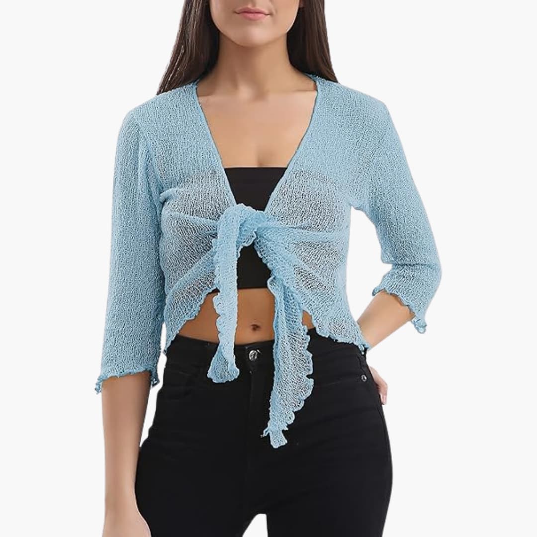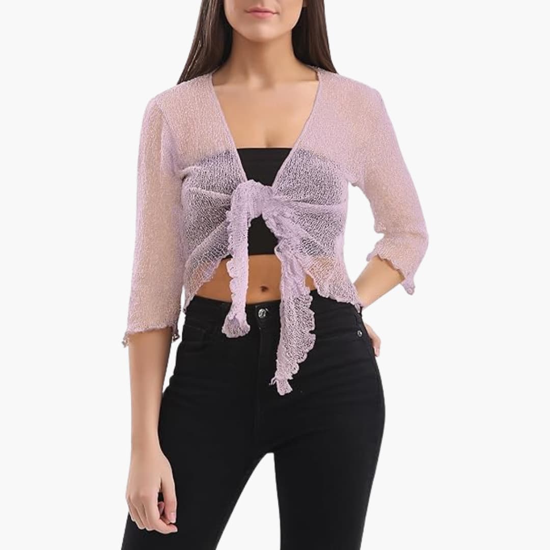 Women's cropped shrug with tie closure and sheer knit texture