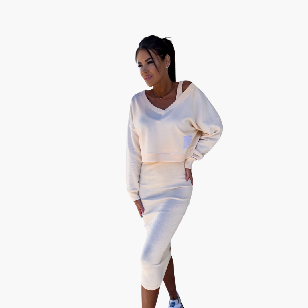 This women’s two-piece sweatshirt and midi dress set is designed with coordinated styling and modern everyday appeal. The cropped sweatshirt features a classic round neckline with pullover construction, dropped shoulders, long sleeves, and a relaxed cut, finished with a clean straight hem and a uniform knitted surface.