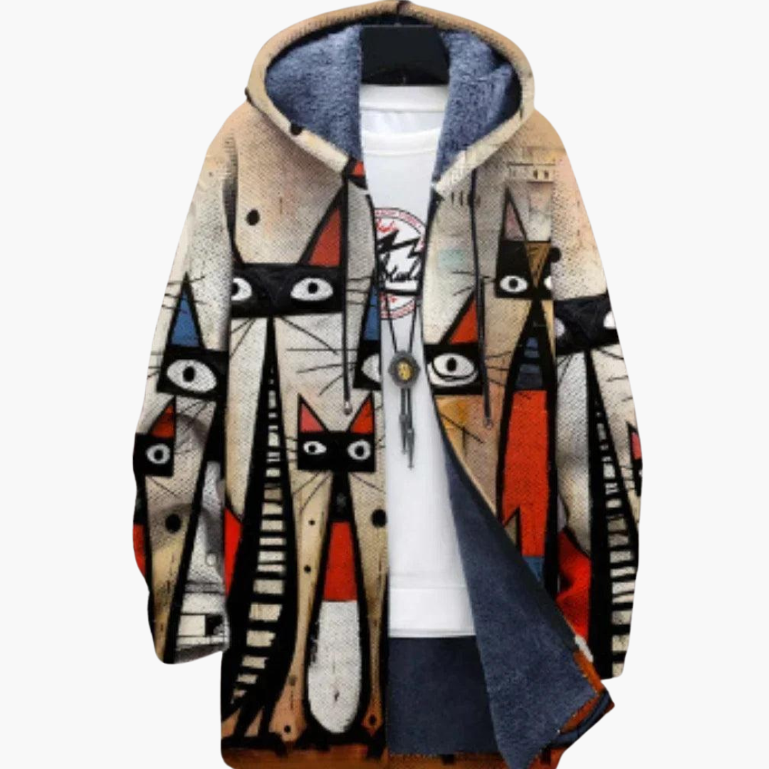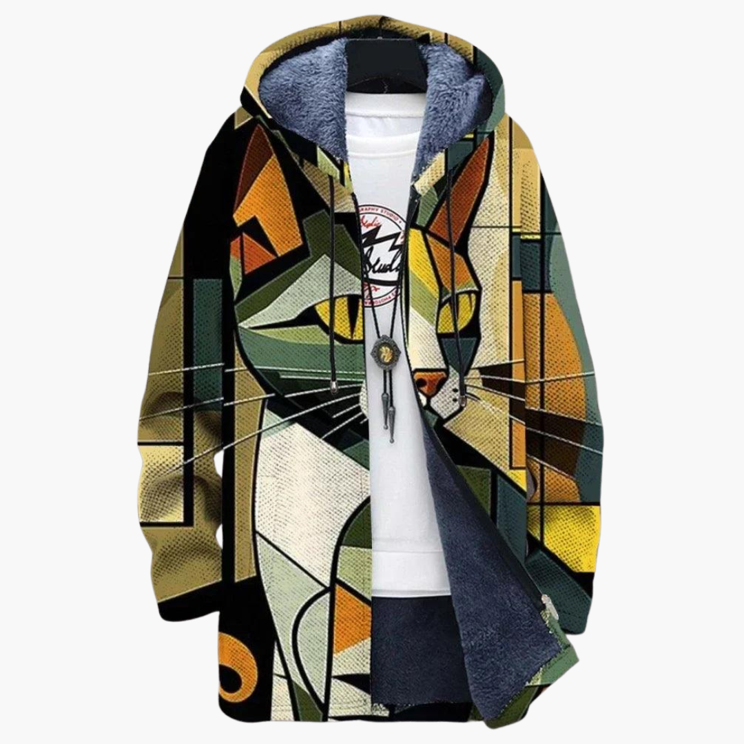 Men’s hooded zip-up fleece jacket with graphic cat print