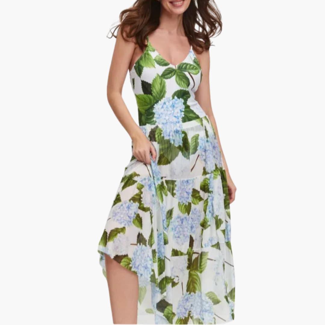 This swimdress features a scoop neckline and sleeveless shoulder straps. The bodice is cut in a fitted shape through the torso. An attached skirt extends from the waist, offering additional coverage. The garment showcases an all-over floral print with an even outer surface in a one-piece design.