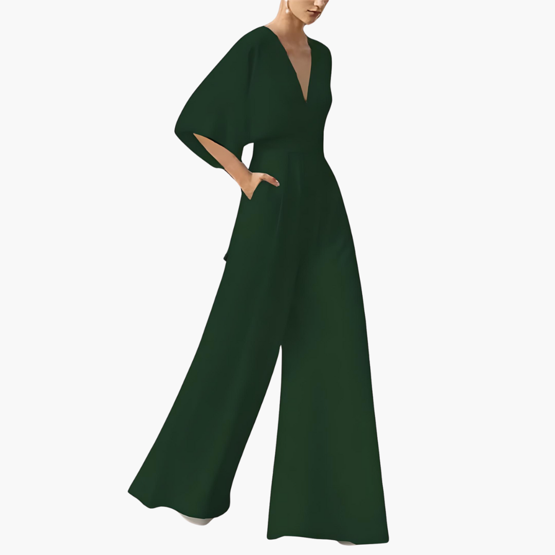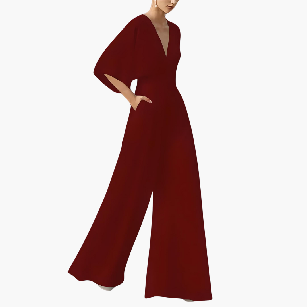 Jumpsuit with deep V-neckline, batwing sleeves, and wide-leg silhouette for a versatile, modern look.