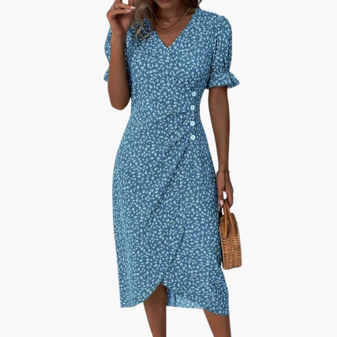 This women's long dress features a deep V-neckline and long sleeves for a defined silhouette. A cut-out detail is positioned at the waist and integrated into the seam structure. Designed in a flowing outline, it extends to ankle length for full coverage. The dress is finished with an all-over floral print on a woven textile and a straight hem for a clean appearance. Suitable for seasonal and occasion wear in the UK.