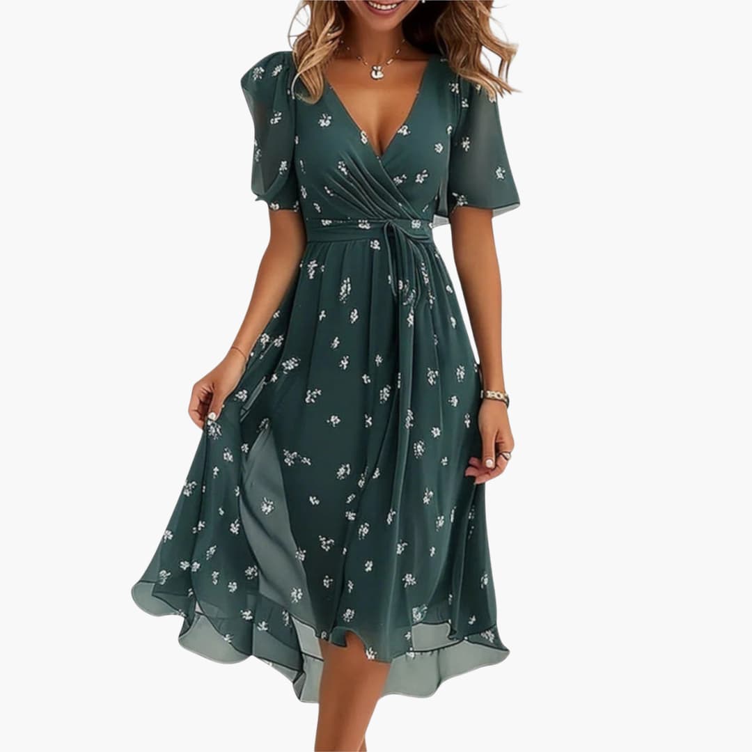 This women’s summer midi dress features a V-neck and short flutter sleeves with a wrap-style bodice and fitted waist. The high-low hem adds dimension while an all-over floral print covers the surface. The silhouette has a flowing skirt and subtle drape for warm-season wear.